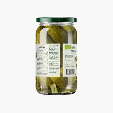 خيار*، ماء، خل*، سكر*، شبت*، ملح بحري، ثوم*، حمض الستريك، بهار حلو*، ورق غار*. *عضوي موثق.